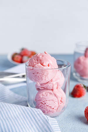Tasty ice-cream in glass on table