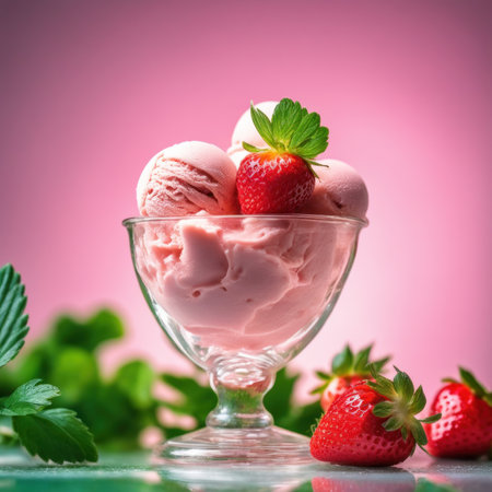 A visually striking image of strawberry ice cream served in an hourglass, complemented by fresh strawberries, all against a vibrant pink background.
