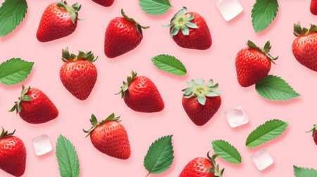Fresh strawberries and mint leaves are patterned on a pink background with a sprinkle of ice cubes.