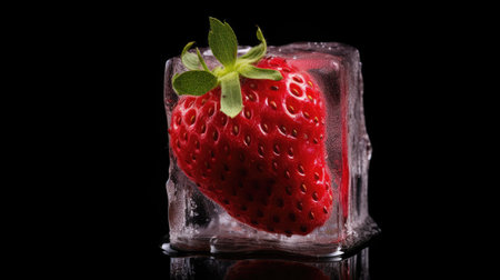 Frozen strawberry trapped in an ice cube, contrasting beautifully with a black backdrop, Ai Generated.