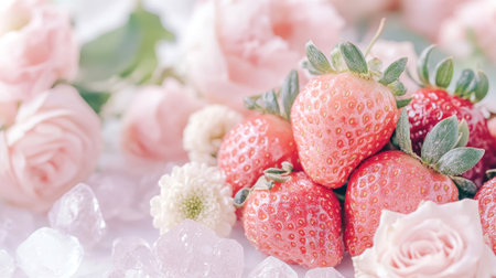 Fresh strawberries nestled in ice with delicate pink roses and white flowers creating a refreshing summery display.
