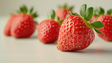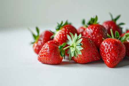 Fresh strawberries laid out on a white background, emphasizing its juiciness.