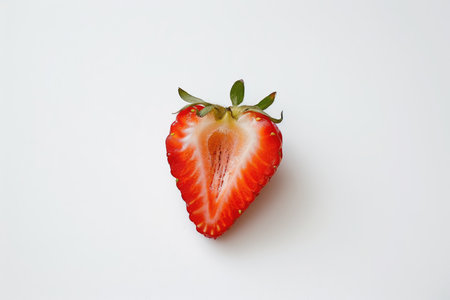 Brightly colored strawberry halves reveal juicy, red flesh and vibrant green leaves. Perfect for culinary designs, healthy recipes, or fresh food presentations.