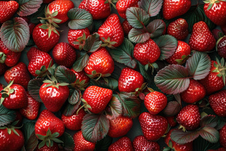 Ripe strawberries fill the canvas, their bright red hue contrasting with vibrant green leaves. The arrangement highlights the freshness and texture of these delicious fruits ready for enjoyment.