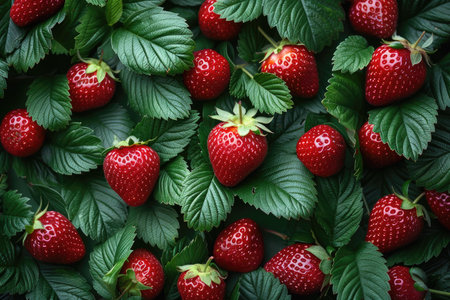 Ripe strawberries positioned among vibrant green leaves with glistening water droplets showcasing freshness. Ideal for concepts in agriculture, gardening, food marketing.