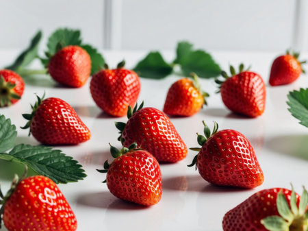 Bright red strawberries with lush green leaves are scattered on a white background. The vibrant colors create an appealing and fresh look, perfect for a summer feast or healthy snacking.