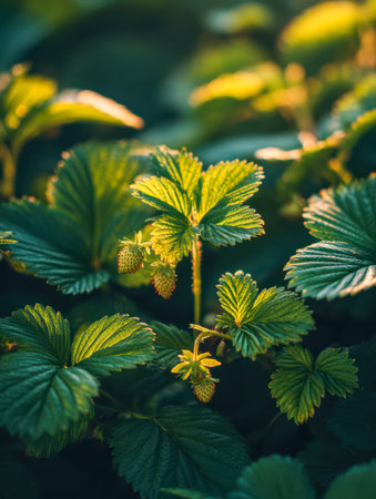 Vibrant young strawberry seedlings bask in golden hour glow, their tender green foliage and tiny immature berries creating a fresh, serene garden scene.