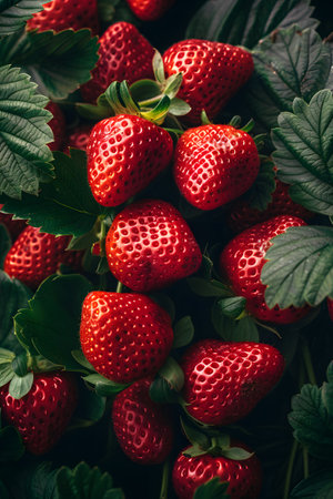Vivid close up of ripe red strawberries with textured leaves, detailed macro shot