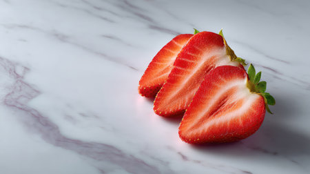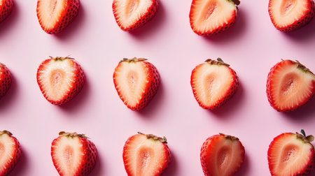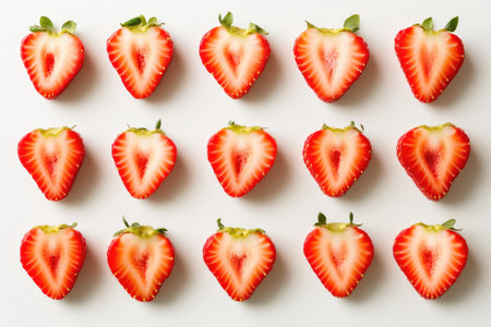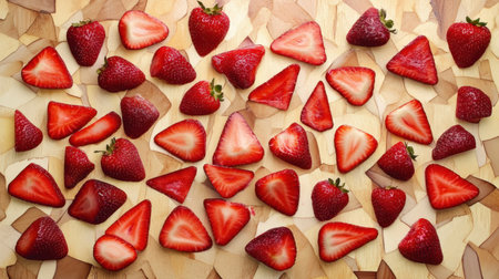 A visually striking arrangement of freshly sliced strawberries showcasing their vibrant red color and juicy texture, perfect for food photography and health-related themes.