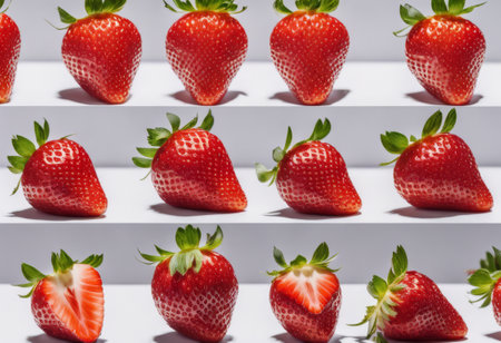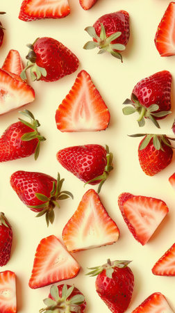 An eye-catching display of fresh strawberries and their sliced counterparts arranged neatly. Perfect for illustrating healthy eating, vibrant colors, and culinary inspiration.