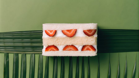 Delicate strawberry slices on a fluffy cream cake placed on green leaves.