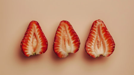 Three halved strawberries on a beige background.