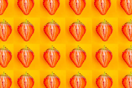 Flat lay of a bright pattern of strawberry halves. Pastel yellow background. Minimalist food concept. Generative AI.