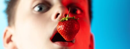 boy biting red strawberries on a blue background