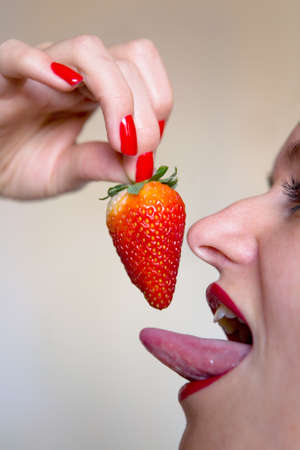 Woman eating strawberries, strawberries, beautiful woman having bitten off strawberries on gray background portrait.