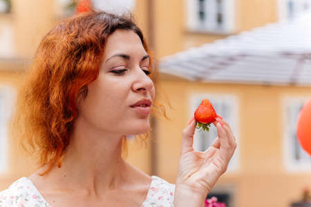 Portrait of the beautiful young woman with fresh red strawberries. Girl enjoy eating appetizing and juicy strawberry. Healthy food