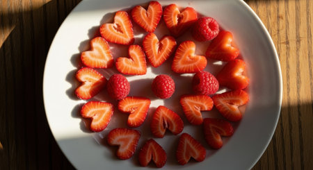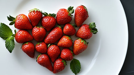 This image showcases fresh red strawberries arranged in a heart shape on a white plate. The vibrant colors and natural freshness make it ideal for culinary designs or themes of love and health.