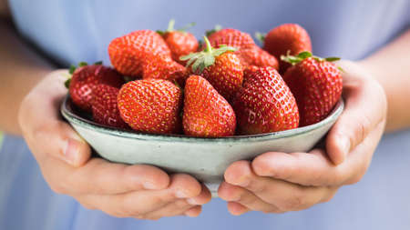 Woman holding fresh strawberries in her hand. Sharing fresh strawberries from the garden.
