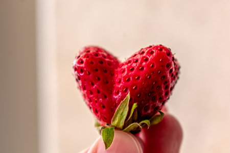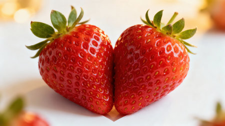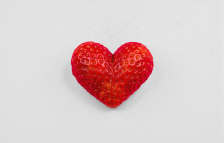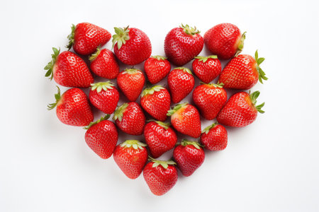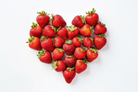 Ripe strawberry forming heart shape, symbol of love and freshness, bright red juicy fruit on clean white background, healthy organic snack, romantic nature theme, natural beauty, summer harvest