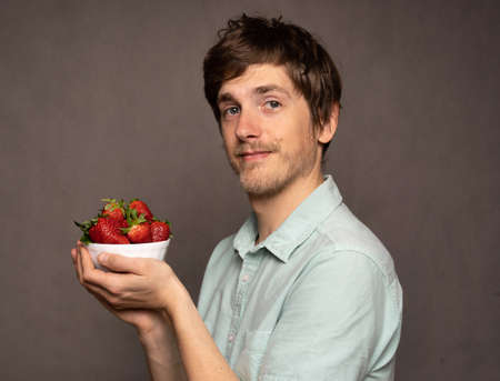 Young handsome tall slim white man with brown hair holding strawberries looking chilled in light blue shirt on grey background