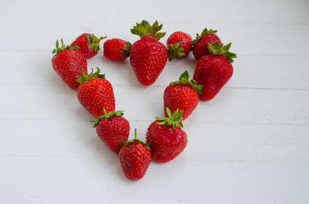 Top view of fresh strawberries on a rustic white wooden table, creating the shape of a heart, as a symbol of love. Concepts, san velentin, romantic
