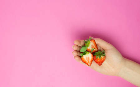 Female hand holding a strawberry on pink background. Flat lay banner. Space for text