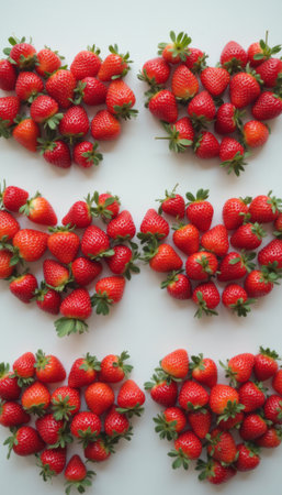 A stunning arrangement of vibrant red strawberries forms six heart shapes, radiating love and sweetness. This visually appealing display captures the essence of romance and joy, perfect for celebrating special moments or sharing with loved ones.