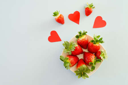 Romantic heart formation with ripe red strawberries, perfect for Valentines Day, healthy food, sweet desserts and summer celebrations