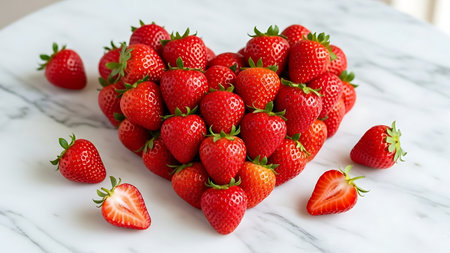 A heart-shaped arrangement of fresh strawberries on a marble countertop, symbolizing sweet and natural love.