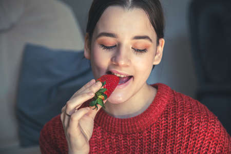 Happy young woman eating strawberries at home.