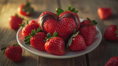 Strawberries with chocolate in the shape of a heart on a wooden background