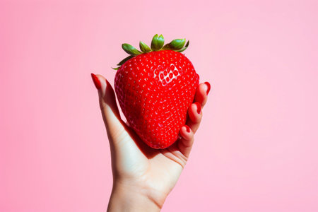 Woman's hand holding strawberry on pink background. Generative AI.