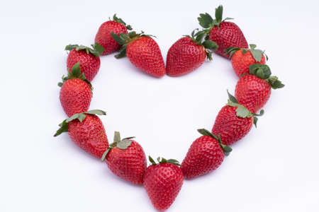 Flat lay composition in heart shape with fresh strawberry isolated on white background.
