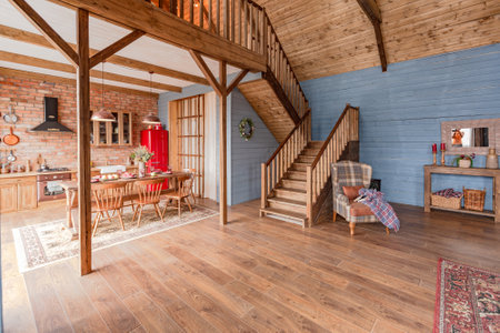 cozy all wooden interior of a country house in a wooden design. spacious living room with kitchen area with large windows. bedroom on the second floor.