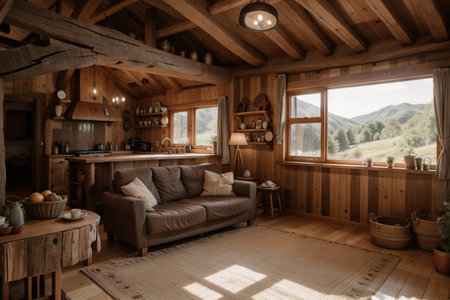 rustic living room with wooden beams and natural elements, created with generative ai