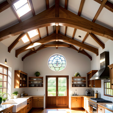 This spacious farmhouse interior showcases modern design elements with rustic touches. High ceilings, wooden beams, and ample natural light create an inviting atmosphere perfect for relaxation and entertaining.
