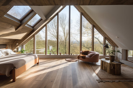 large attic room with floor-to-ceiling windows, providing stunning view of the outside surroundings, created with generative ai