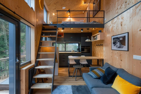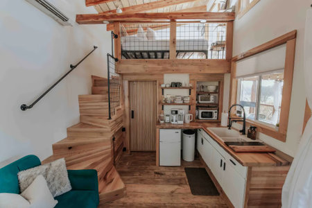 Cozy Modern Tiny House Interior with Loft, Wooden Design, and Bright Natural Lighting