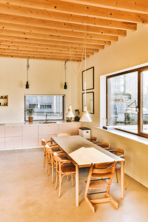 Interior of a modern dining room with wooden ceiling and green chairs