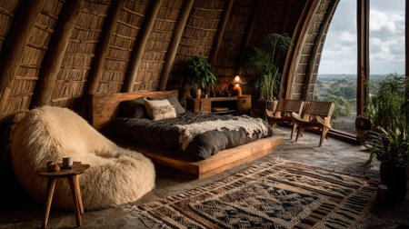 Cozy rustic bedroom retreat with sunlight streaming through window in log cabin attic. That the image is generated using AI.
