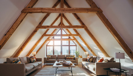 Cozy attic space with exposed beams, comfortable furniture, and a relaxed atmosphere, ideal for a unique and personal retreat.