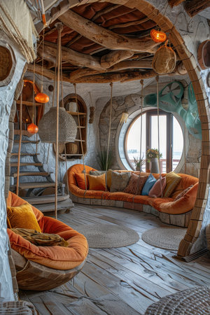 An eco-friendly earthship home built from sustainable materials, harmonizing with the environment