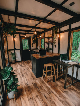 This interior showcases a space with wooden floors, natural light, and a black wooden structure. The design features a workspace with a laptop, a kitchen island, and a wooden stool. It suggests a cozy and functional living area suitable for various commercial or editorial applications.