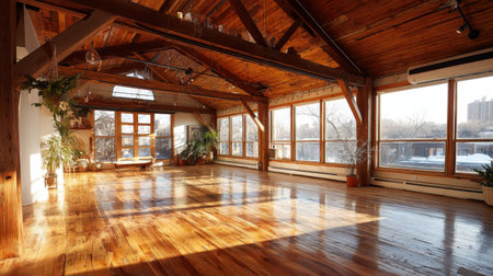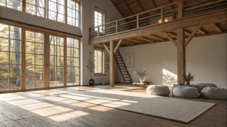 This image showcases a spacious and bright rustic loft interior featuring large windows and wooden beams, perfect for creative living and workspaces.