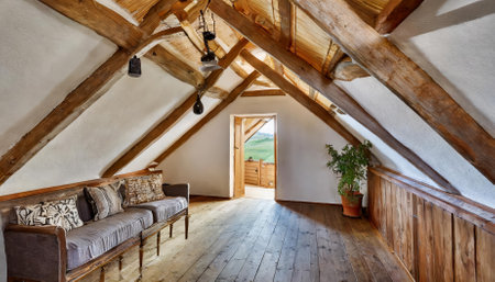 Interior of a rustic wooden house. Furniture in the attic.