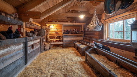 rustic barn with sun shining through the windows, illuminating the interior, created with generative ai