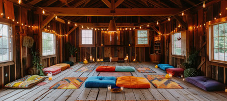 A serene group meditation session held in a rustic barn adorned with soft string lights and vibrant cushions. the bohemian atmosphere fosters relaxation and tranquility, ideal for mindfulness retreats or personal reflection spaces.