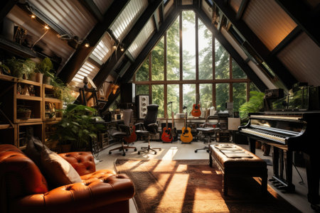 An attic recording studio with a skylight and vintage accents --ar 3:2 --v 5.2 Job ID: ac7e911e-9c49-4319-8074-450d0a6fb417