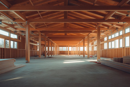 Sunlight streams through large windows, illuminating the expansive interior of a wooden building under construction. Stacks of materials are lined against the walls, highlighting ongoing work.