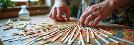 Female hands arranging dried plant strips on patterned tablecloth in sunlit room. That the image is generated using AI.